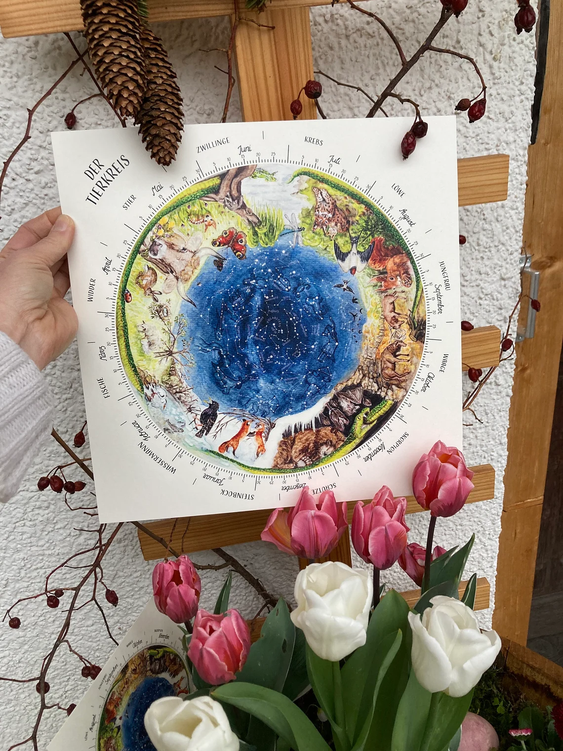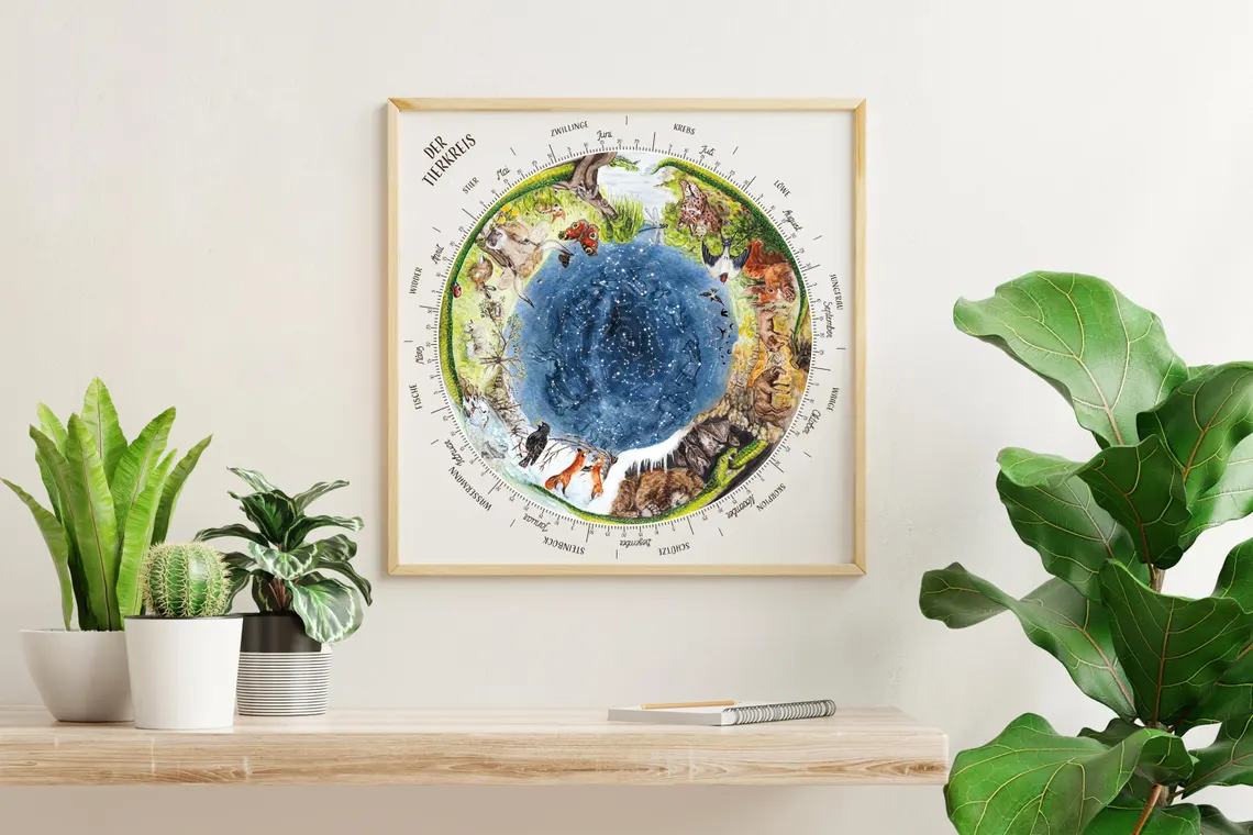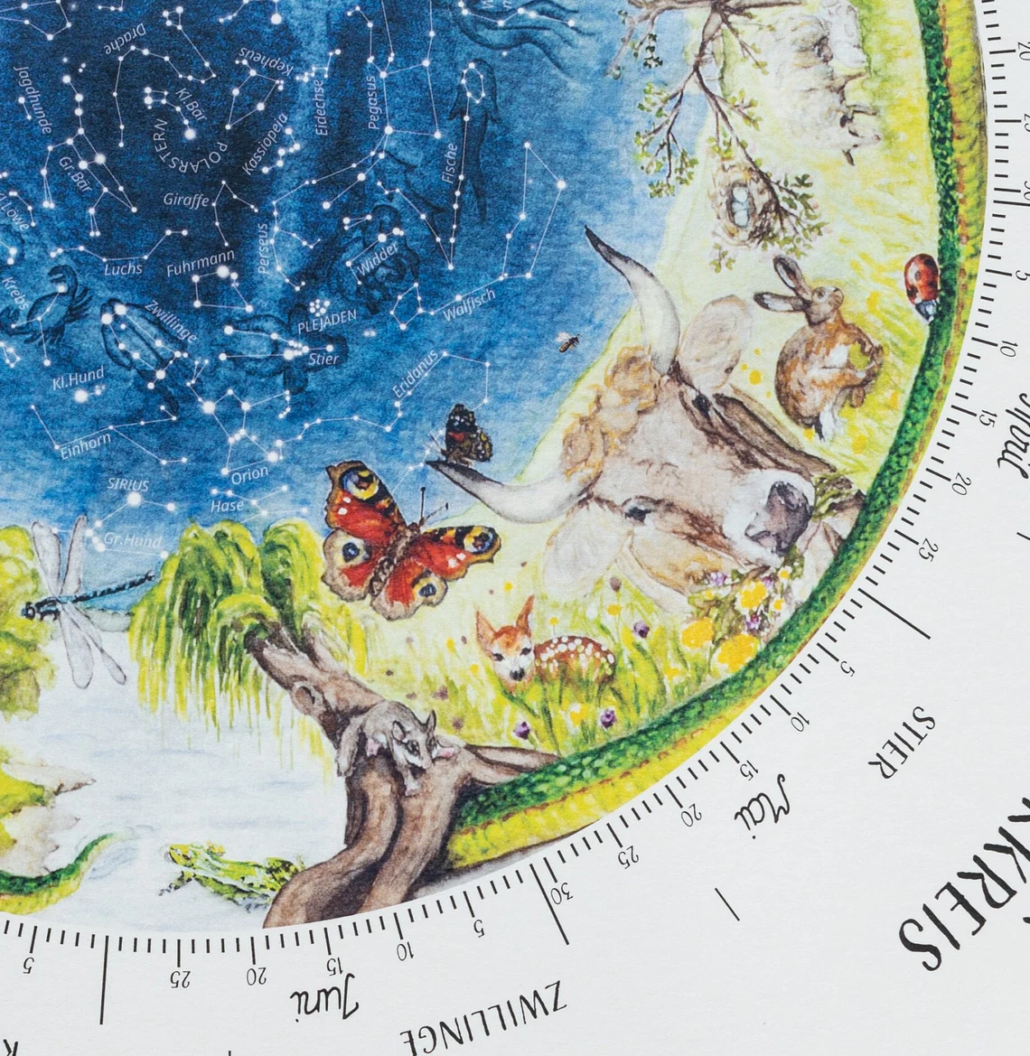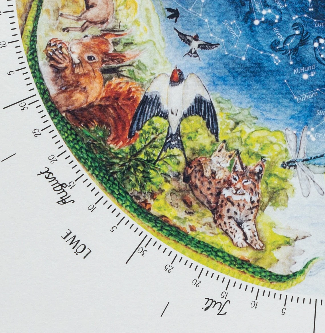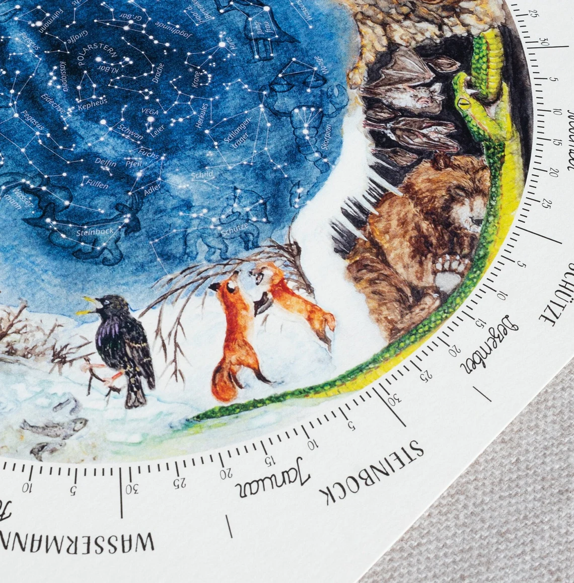 Sternenhimmel und Tiere, wie passt das zusammen? Sehr gut, denn mehr als die Hälfte aller 48 Sternbilder der nördlichen Hemisphäre tragen Tierbezeichnungen. Und so tummeln sich auf dieser bunten Sternenkarte rund um den Nachthimmel unsere heimischen Tiere im Lauf der Jahreszeiten. Sie kuscheln zum Winterschlaf in der Höhle, kauen genüsslich auf frischen Frühlingskräutern oder sammeln die herbstlichen Früchte für ihren Wintervorrat. Der Ouroboros, die sich in den Schwanz beißende Weltenschlange als das Symbol für den ewigen Kreislauf des Werdens und Vergehens, schlängelt sich um das gesamte Bild – so wie das Sternbild der Wasserschlange einen großen Bereich des nördlichen Sternenhimmels umfängt. So begeistert dieses außergewöhnliche, handgemalte Sternenhimmel Poster die jungen Sternengucker und Tierfans gleichermaßen. Das ideale Astronomie-Geschenk für große und kleine Naturfreunde und ein wunderbarer Wandschmuck fürs Kinderzimmer oder auch für jeden anderen Raum in einem verspielten, lebendigen Zuhause.