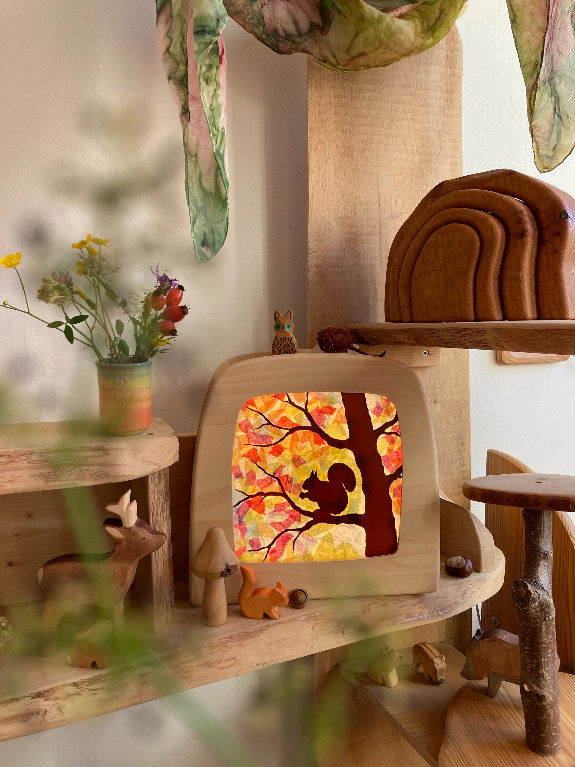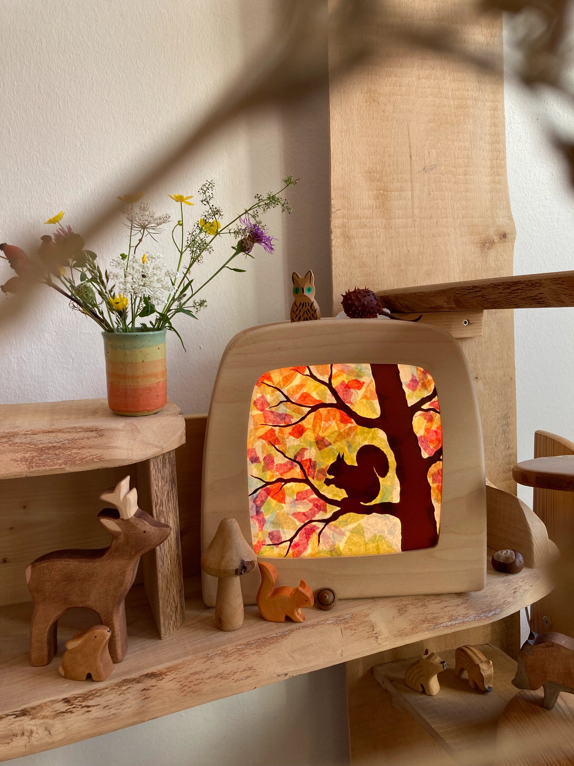 Lass deine Fantasie durch die Bäume tanzen. Füge echte Blätter hinzu, spiele mit Licht und Farbe und lass das Eichhörnchen lebendig werden.