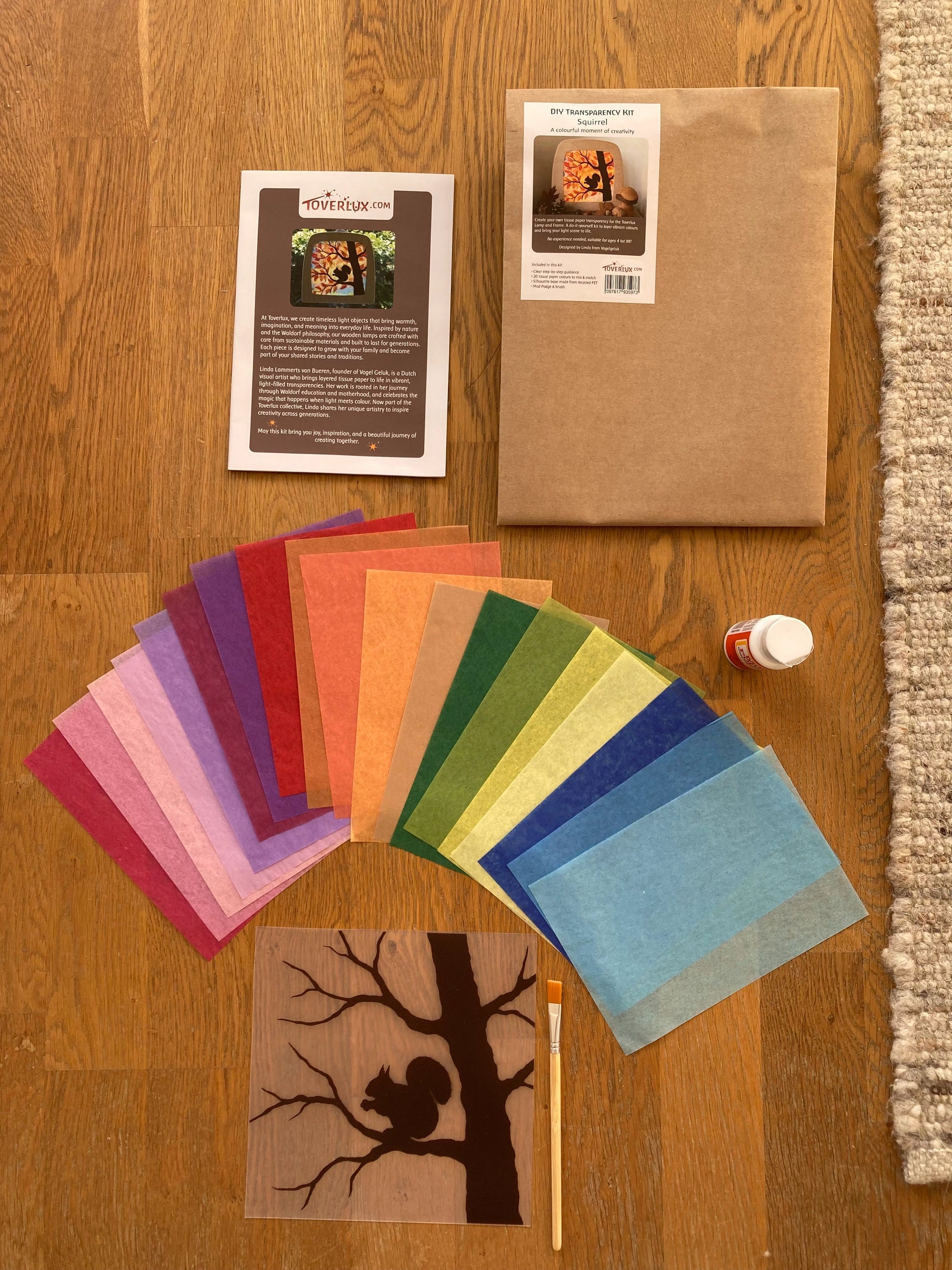 Bringe Wärme, Fantasie und ein wenig Waldzauber-Zauber in dein Zuhause mit dem Squirrel DIY Transparency Kit von Toverlux. Entworfen von Linda von Vogel Geluk, lädt dich dieses Set dazu ein, eine leuchtende Lichtszenen mit mehrlagiger Tissue-Papier-Schicht und einer charmanten Eichhörnchen-Silhouette, die in einem Baum rührt, zu gestalten.